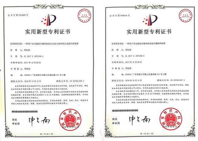 值得一提的是湛江市金順糧食機(jī)械制造有限公司通過iSo9001體系已獲得多個專利,其中有外觀專利(多功能碾米機(jī));實用專利(一種多功能組合碾米機(jī)、一種用于多功能組合碾米機(jī)的去石機(jī)與礱谷機(jī)以及提升機(jī)裝置、一種用于多功能組合碾米機(jī)的混合糠粉碎裝置、一種用于多功能組合碾米機(jī)的電控與風(fēng)機(jī)裝置、一種用于多功能組合碾米機(jī)的比重篩和碾米機(jī)裝置);發(fā)明專利(湛江碾米機(jī)、符氏ZJF-15-40M&S型號組合碾米機(jī))等。